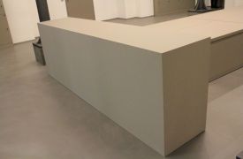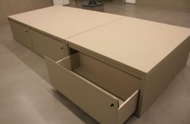Ein mobiler Tresen für die Ausgabe der Garderobe bei Veranstaltungen ist mit Rollen ausgestattet und kann beliebig im Raum positioniert werden. Der Korpus auf Gehrung zusammengebaut. Die Front ist gerade und schlicht auf der anderen Seite befinden sich offene Fächer. Zusätzlich wurden sechs mobile Aufbewahrungs-Container angefertigt, diese werden benutzt für Rucksäcke und Taschen von Besuchergruppen.